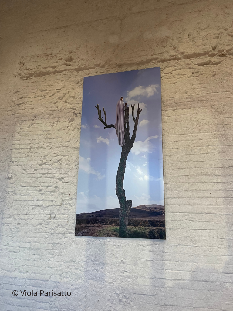 I medium che utilizza Maïmouna Guerresi nella sua carriera artistica sono fotografia, scultura e video installazioni: nell’esposizione in questione vediamo infatti una scultura, quattro fotografie e due video. Le opere dell’artista sono caratterizzate dalla presenza continua di figure femminili, abitanti di paesaggi sospesi che trasmettono un messaggio molto profondo come la ricerca del superamento dei confini culturali, sociali e di genere rispetto al ruolo della donna nell’Islam sofista africano. Lo scopo del lavoro della Guerresi è quello di mettere in discussione l’immaginario eurocentrico fatto di preconcetti legati a distanze e differenze geografiche e antropologiche, cambiare la propria visione del mondo. I temi che affronta nel suo percorso artistico sono: la femminilità e l’armonia tra culture diverse, passando attraverso la propria sensibilità spirituale ed estetica. Il filo tematico della mostra, che accomuna tutte le opere lì esibite, è l’elevazione femminile e la sua essenza materna e misericordiosa, cercando di dimostrare l’evoluzione identitaria, spirituale, culturale e umana della figura rappresentata. Per l’artista le figure femminili sono le protagoniste, poste in una dimensione a-temporale, della forza di natura spirituale e rigenerativa che supera i confini geografici e di genere attraverso le quali si esplorano due mondi, spirituale e politico sociale, tradotti in un linguaggio metafisico. Un altro aspetto molto interessante dell’arte di Maïmouna Guerresi è il riportare la sua visione introspettiva degli impulsi ricevuti dalle sue due culture, europea e africana, unite alla spiritualità sufi islamica. Questa mescolanza di culture nelle sue opere viene espressa con costumi, personaggi, calligrafie e simboli, scenografie e murales dipinti da lei stessa. Il velo della donna, che levita ed è sospesa nel tentativo di ricercare il proprio equilibrio interiore ed estetico, è irrigidito da una materia che diviene corteccia oppure contenitore di un corpo mistico. Il concetto di corpo-albero è al centro del pensiero dell’artista come si può ben vedere in Stilita Khadija, metafora dell’albero che fa da ponte tra cielo e terra.